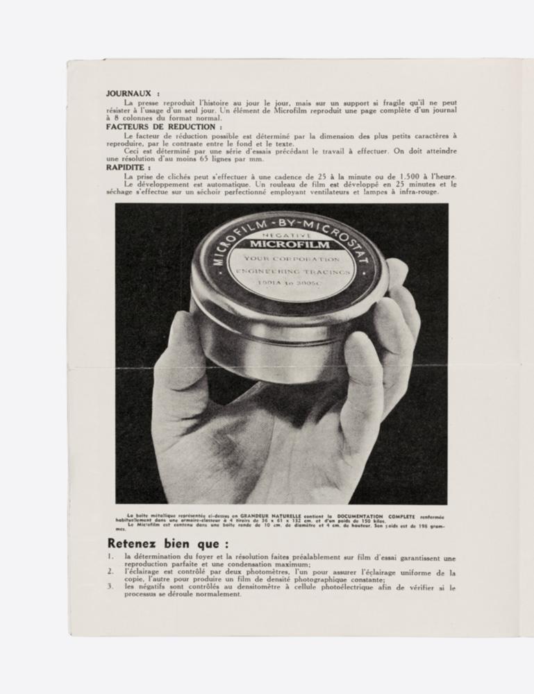 Rouleau de microfilm Microstat Corporation dans son boîtier métallique, annonce publicitaire, 1948. Bruxelles, Bibliothèque royale de Belgique (B 8495 1948 5).