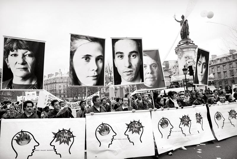Marc Pataut, portraits de chômeurs portés par eux-mêmes lors de la manifestation de la CGT contre le contrat d’insertion professionnelle (CIP), Paris, place de la République, 12 mars 1994.