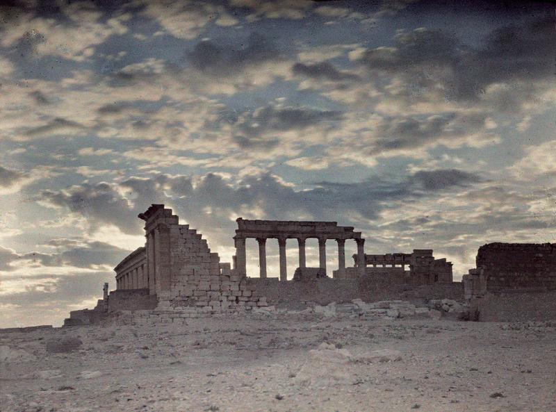 Frédéric Gadmer, « Ensemble du Temple du Soleil au jour naissant », Syrie, Palmyre, 18 octobre 1921, autochrome, 90 x 120 mm. Boulogne-Billancourt, musée départemental Albert-Kahn, collection Archives de la planète (A 29 705 S). © Musée départemental Albert-Kahn.