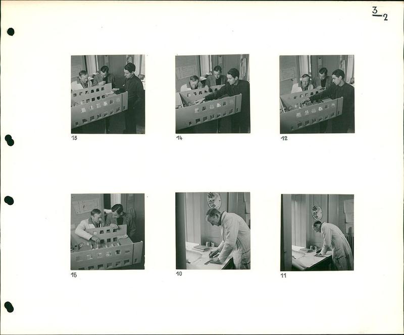 4. Carton comprenant plusieurs photographies illustrant l’activité du scénographe d’exposition, « Travail préparatoire. Inspection du travail préparatoire pour l’exposition Extension des cultures ou famine à Zurich, avec messieurs Faucherre et Engesser », Zurich, vers 1942, tirages en noir et blanc collés sur carton. Bâle, Zentralarchiv Coop.