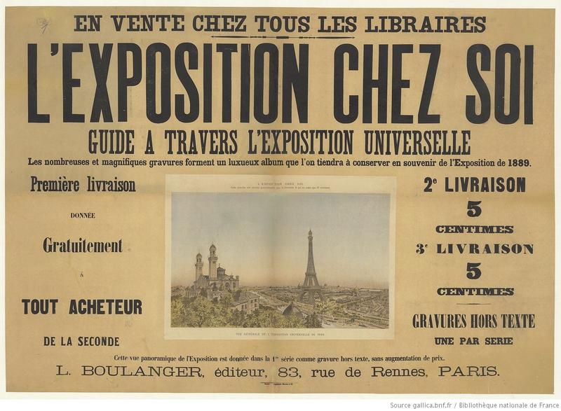 5. Affiche « L’Exposition chez soi. Guide à travers l’Exposition universelle », Paris, 1889, lithographie collée sur papier, 85 x 122 cm. Paris, Bibliothèque nationale de France, département Estampes et photographie.