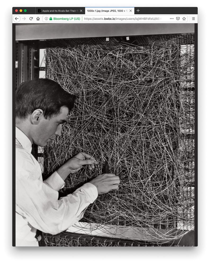 Un ingénieur du Cornell Aeronautical Laboratory travaillant sur le réseau de neurones artificiels Perceptron développé par Frank Rosenblatt, Buffalo, circa 1960.