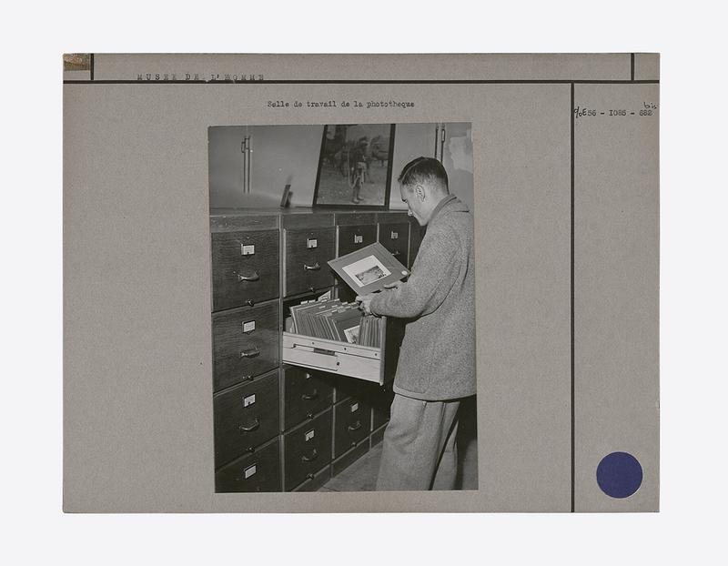 Agence Diloutremer, « Musée de l’Homme. Salle de travail de la photothèque », consultation d’un fichier, Paris, circa 1950-1956, tirage argentique monté sur carton, 22,5 x 29,5 cm. Paris, musée du quai Branly-Jacques Chirac (PP0090871).