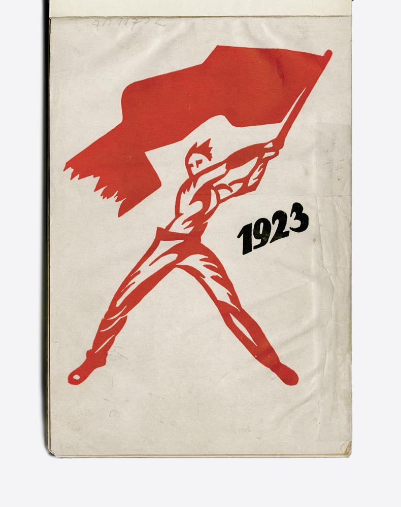 Jolán Szilágy, page de titre de l’Arbeiterkalendar de 1923, linogravure, 22 × 13,4 cm, 1922. Deutsche Nationalbibliothek Leipzig.