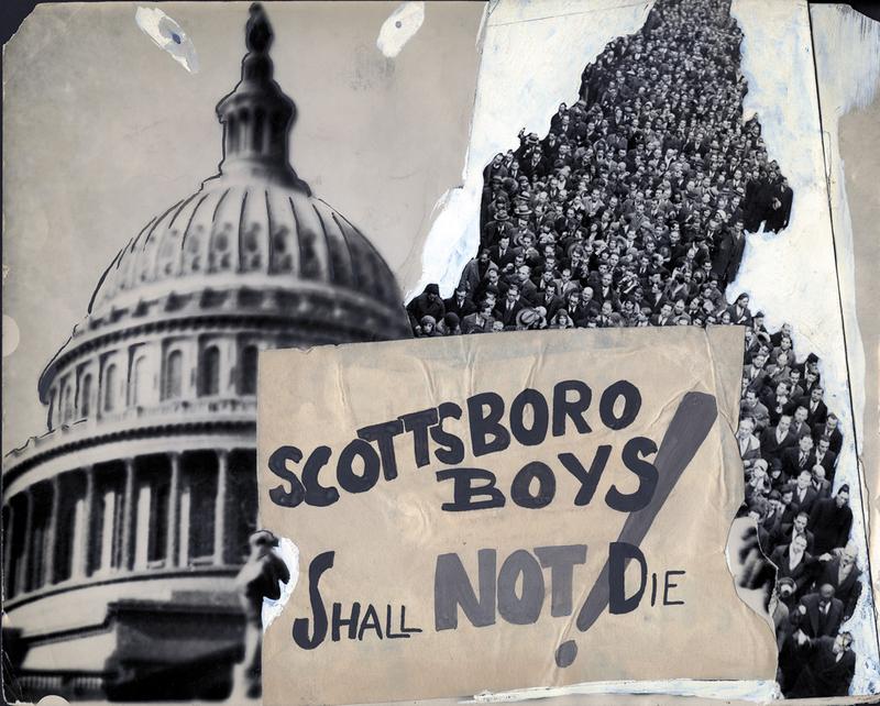 Workers Film and Photo League, « Les garçons de Scottsboro ne doivent pas mourir ! », photomontage (tirages argentiques, encre et gouache blanche sur papier), circa 1930-1934, 20,3 × 25,4 cm. New York University, Tamiment Library, Daily Worker and Daily World Photographs Collection (boîte 98, 19168).
