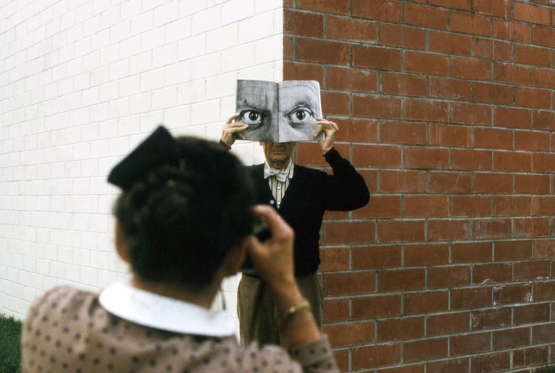 Ray Eames photographiant Charles avec un livre de Picasso, devant le 901, Venice (Los Angeles), s. d., diapositive. Los Angeles, Eames Office LLC (CR_RYs205).