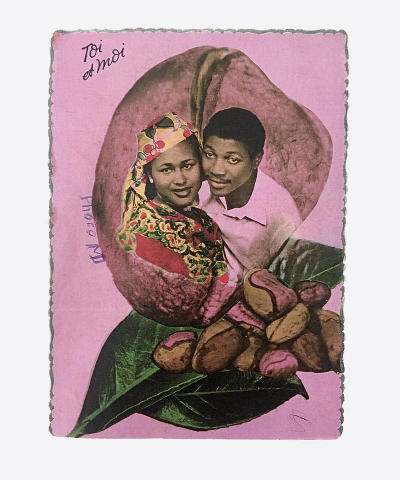 Mountaga Dembélé, couple dans une noix de kola, Bamako, circa 1940-1950, montage photographique avec colorisation, 10,5 x 7,5 cm.