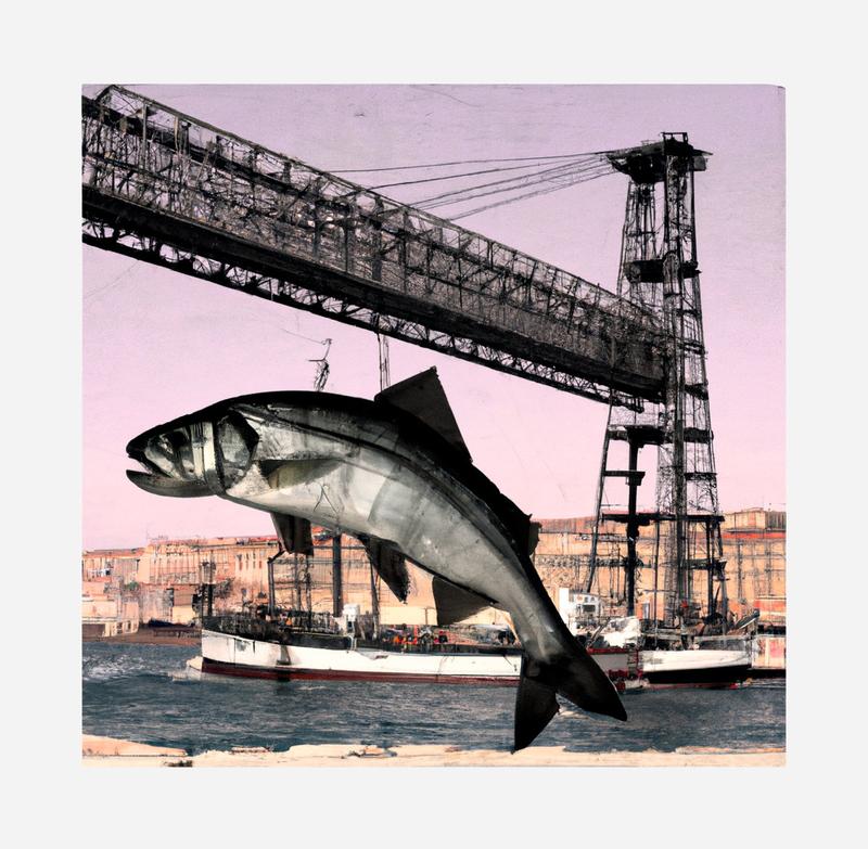 Image générée à partir du prompt « A giant sardine blocking the entrance of the harbour in Marseille, transporter bridge in the background, old French postcard » (voir fig. 3, p. 9) sur le site openai.com/dall-e-2/, 9 novembre 2022.